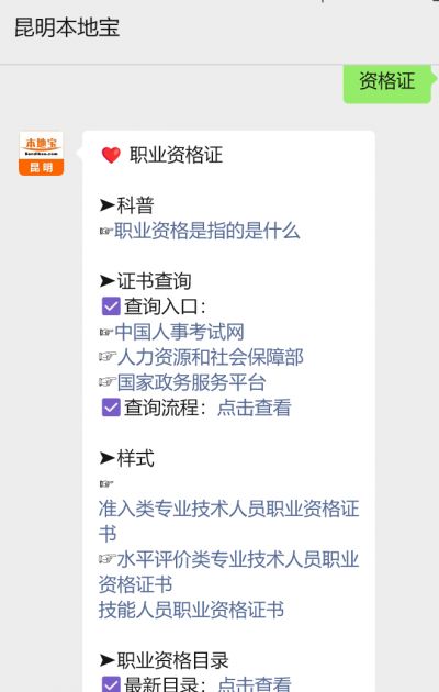 温馨提示:微信搜索公众号【昆明本地宝】,关注后在对话框回复【资格证】可获取云南各类职业资格证报名、考试、成绩查询指南,以及证书查询入口、最新职业资格目录名单等指南;